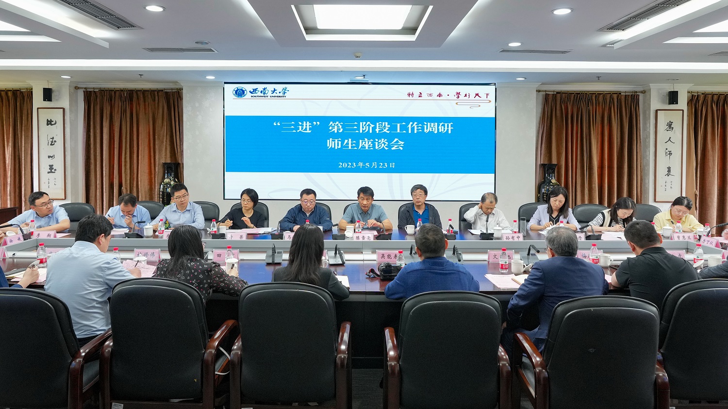 座谈会上,陈雪亮充分肯定了学校“三进”工作,表示学校的“三进”工作“课程建设扎实有力,教学体系实现创新,教材真正进入课堂”。他从学生学习方法、教师授课方式、教材选用策略、资源利用等方面提出意见建议,希望学校进一步加强师生对习近平新时代中国特色社会主义思想的学习,扎扎实实学原文、读原著、悟原理,充分利用好校内资源,依靠虚拟教研室共商共建共享教学资源,进一步提高教学质量和学习效果,持续推进“三进”工作,培养更多外语传播人才。
