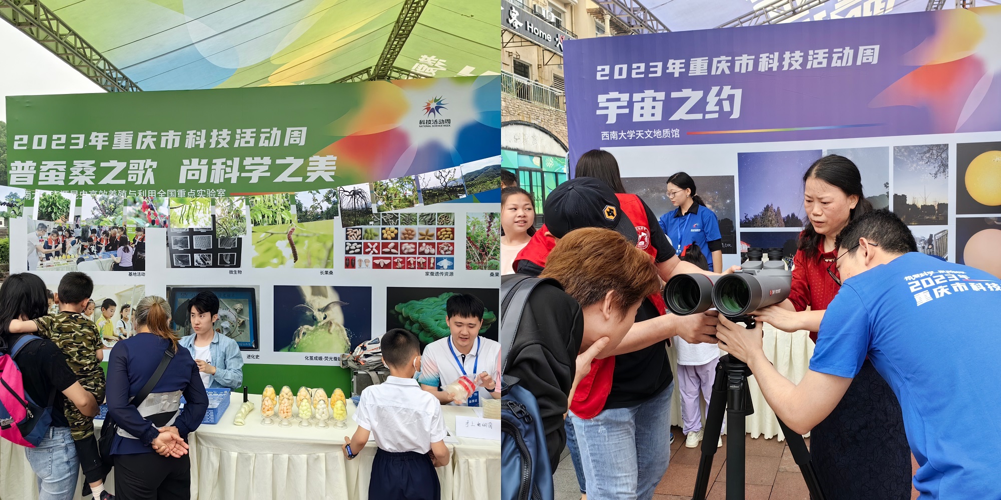 5月20日至22日,重庆市科技活动周主会场展览在大学城熙街拉开序幕,学校资源昆虫高效养殖与利用全国重点实验室和天文地质馆受邀出展,以“普蚕丝之光 尚科学之美”和“宇宙之约”两大主题向社会各界介绍了世界上最大的家蚕遗传资源库和蚕桑科技创新成果,以及天文地质科普知识和亲眼观测太阳星空等交互性科普体验活动。