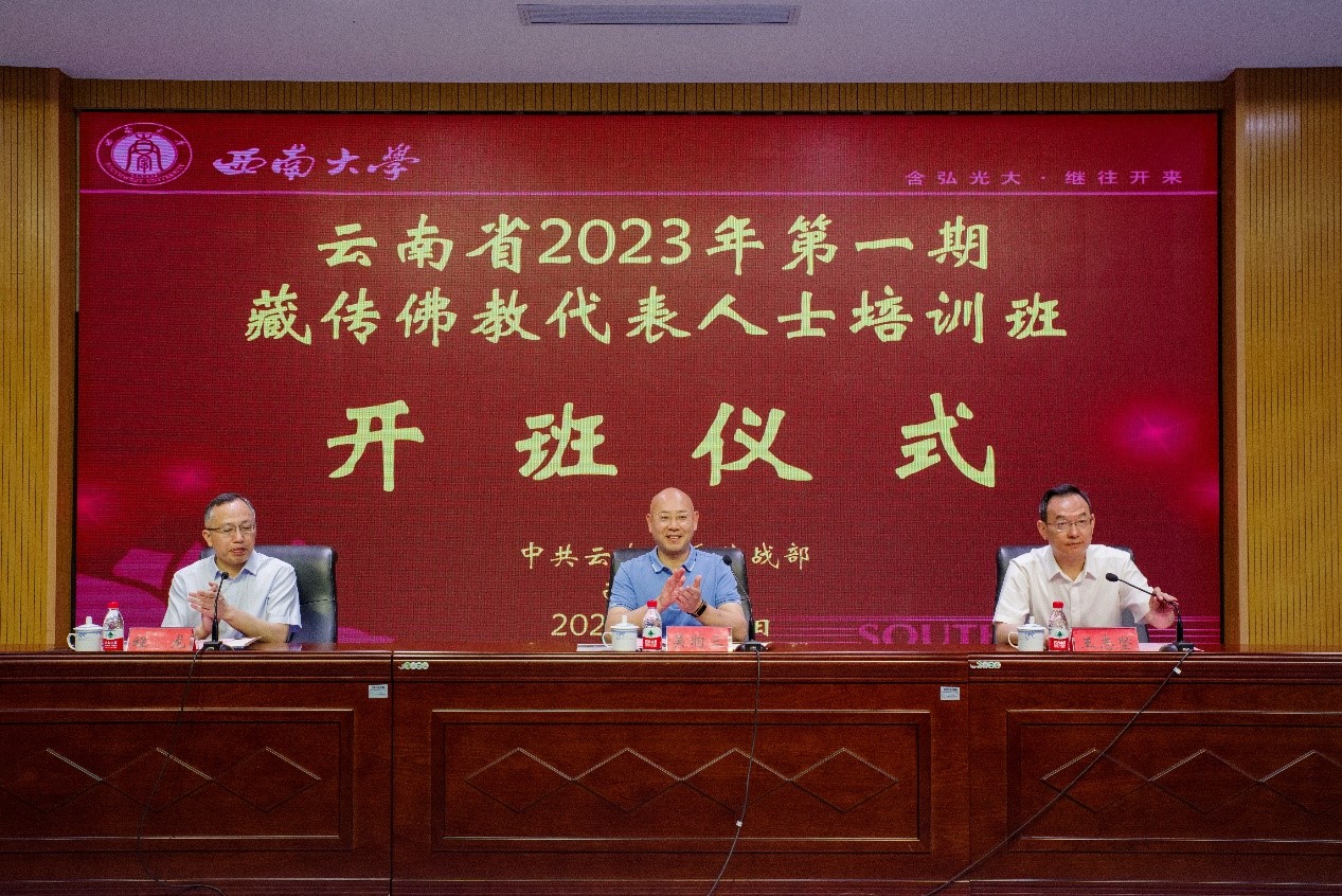 由中共云南省委统战部主办,学校承办的“云南省2023年藏传佛教代表人士培训班”于6月12日在校开班。中共云南省委统战部副部长吴昀三、学校副校长王志坚出席开班仪式。来自迪庆、丽江、怒江三个州市100余名藏传佛教代表人士参加此次培训。