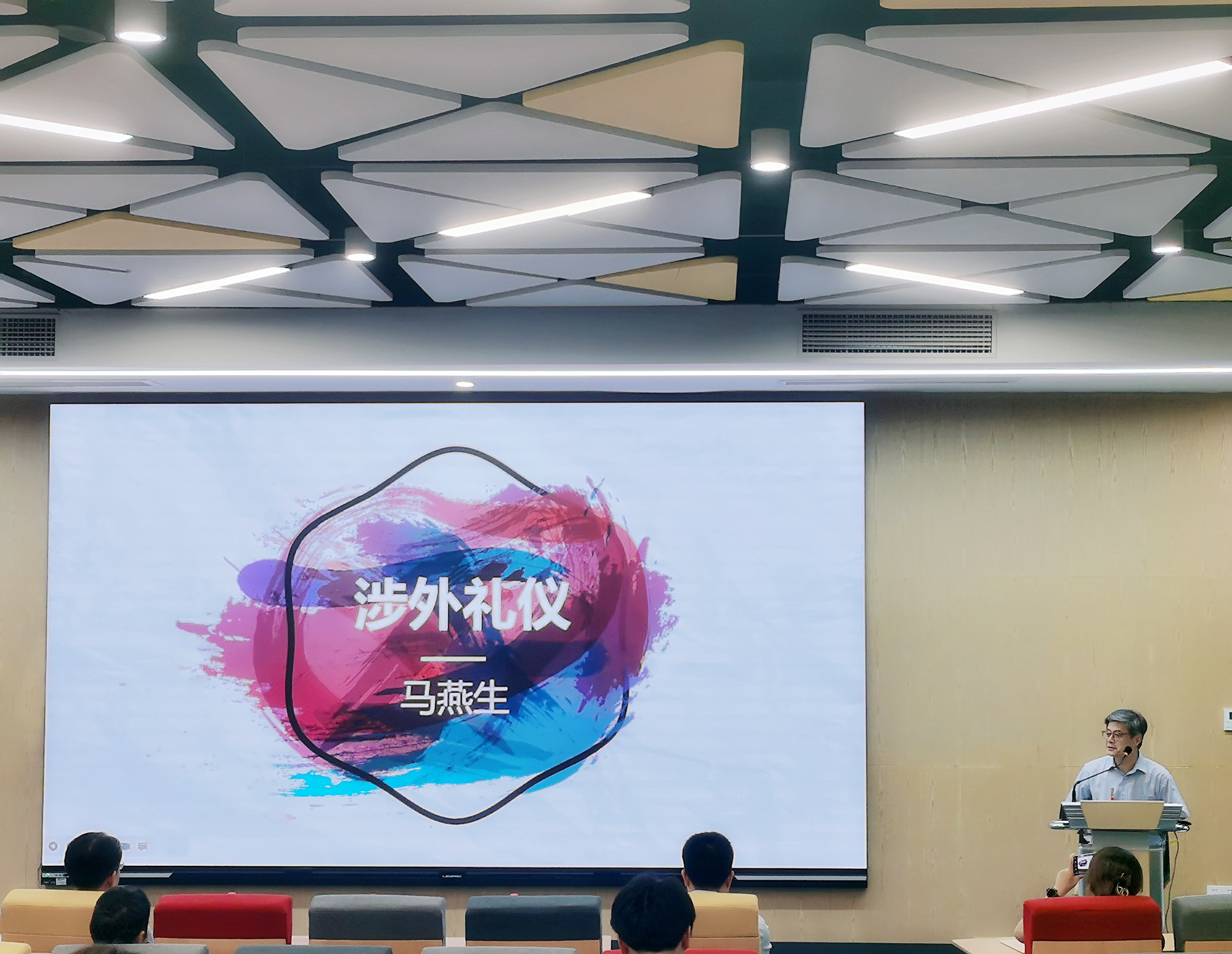马燕生结合丰富的教育外事工作和国际组织工作的实践经验,从涉外礼仪的六个基本原则与重要性、涉外人员的形象与注意事项、涉外礼仪的文化背景与深刻内涵,以及如何遵守礼仪并提升形象等方面为在场师生进行了生动细致的讲解。马燕生强调,涉外礼仪内容广博、包罗万象,涉外人员讲礼仪、重形象,要以德为本,修身为先,遵循“从修身做起、从平时做起、从小事做起、从对内做起、从自己做起”的原则,在跨文化沟通与合作过程中做到有礼有节,传播中国故事,树立中国形象。