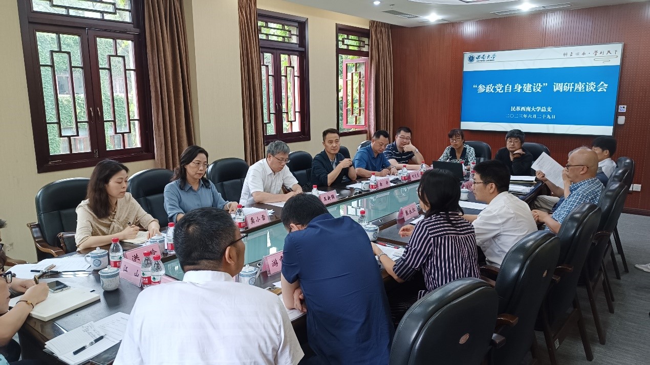 在“参政党自身建设”调研座谈会上,民革西大总支作工作汇报,与会民革党员围绕调研主题,结合自身实际,进行了踊跃交流发言。