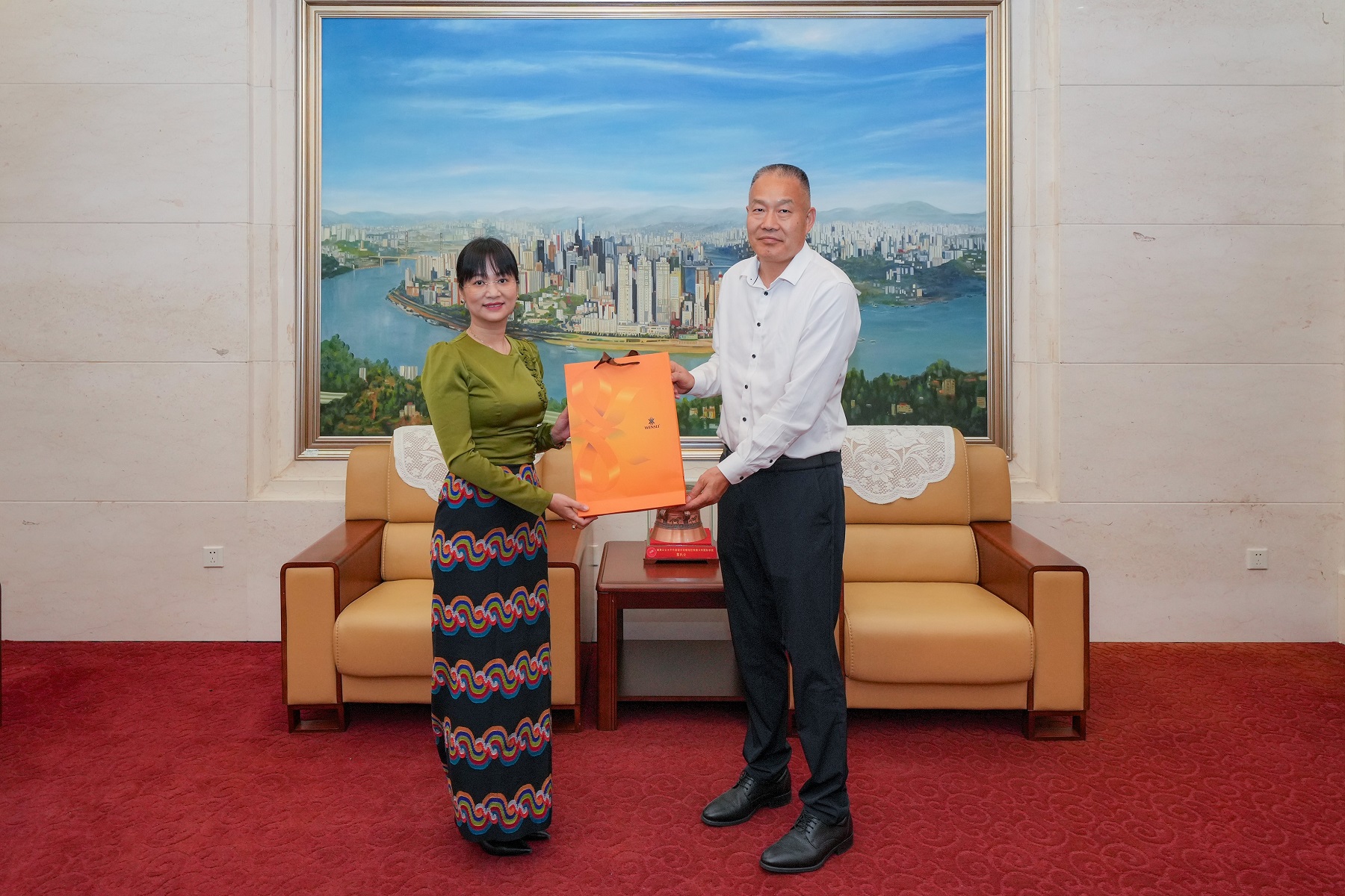 开班仪式前,葛信勇会见信雅女士,并赠送纪念品。
