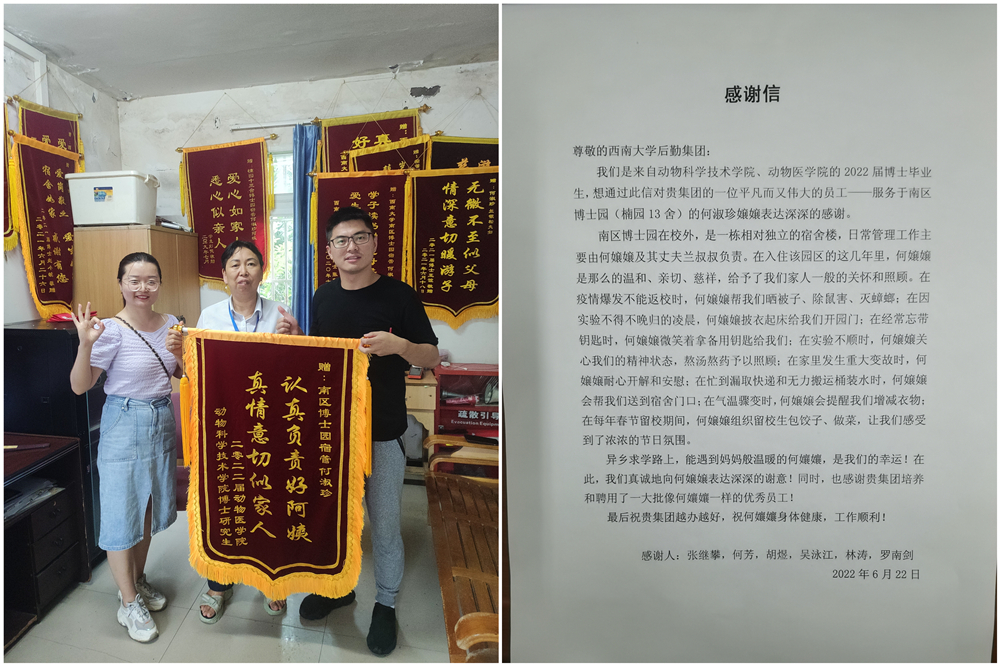 何淑珍2005年进入学校后勤集团工作,一直担任宿舍值班员,轮岗足迹几乎遍布每个学生园区。不论男生宿舍还是女生宿舍,不论本科生宿舍还是研究生宿舍,她都凭着一股子“重庆嬢嬢”特有真诚负责赢得学生的喜爱和尊重。18年来,何淑珍屡次获得重庆教育后勤协会学生公寓管理工作年度先进个人;2018年劳动节当天的《中国教育报》头版“新时代奋斗者——寻找校园最美劳动者”系列报道中,《博士园的宿管嬢嬢》讲述的就是何淑珍的事迹;当年8月,她还荣登重庆好人榜,并获得“敬业奉献好人”称号。但最令何淑珍骄傲的事,是不论她在哪栋宿舍工作,天南海北的毕业生总能千方百计找到她的值班室电话,逢年过节都不忘给她送上祝福。她说,这是她数十年保持高昂工作热情的秘方。