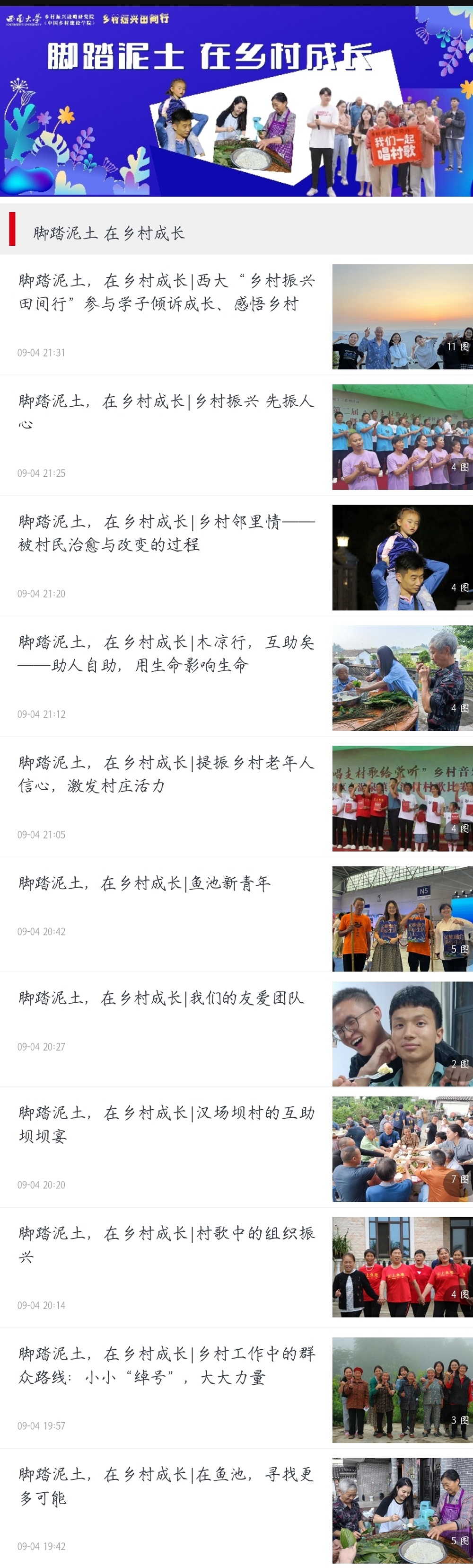 “脚踏泥土,在乡村成长”专栏共刊发文章11篇,分别以“村歌中的组织振兴”“乡村工作中的群众路线”“被村民治愈与改变的过程”“寻找更多可能性”“提振乡村老年人信心”“激活村庄活力”“村庄新青年”等主题,记录了同学们的收获与感悟。这些文章不是他们乡村实践的结束,而是进一步思考乡村、建设乡村、振兴乡村的开始。