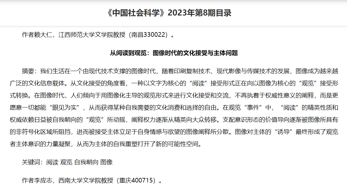 近日,文学院李应志教授在《中国社会科学》2023年第8期发表文章《从阅读到观览:图像时代的文化接受与主体问题》。该文是国家社科基金项目《马舍雷“文学哲学”与西马文论的“后学”转向研究》的阶段性成果和延伸性研究,是西方马克思主义文论有关意识形态理论在视觉文化转型中的一个应用性研究。文章主要讨论了视觉文化和图像时代文化接受的转变趋势,即从文字媒介为主的“阅读”模式向图像媒介为主的“观览”模式的转型。