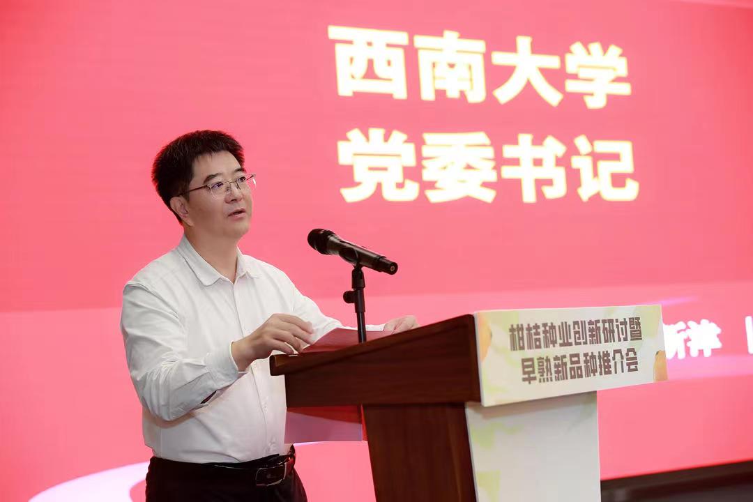 9月24日,由学校主办,柑桔研究所、国家柑桔工程技术中心和四川陶然柑桔新品种研究有限公司承办的“柑桔种业创新研讨暨早熟新品种推介会”在成都新津天府农业博览园举行。会上,柑桔研究所与公司共同选育的第6代杂交柑桔新品种——“川津5号”和“川津1号”正式亮相,填补了国内外无特早熟杂交柑桔的空白,引领我国柑桔种业快速发展。中国农业技术推广协会会长陈生斗,校党委书记李旭锋、副校长王进军,四川省乡村振兴促进会会长边慧敏等领导出席会议。近200位各主产县(市、区)相关领导、行业主管部门负责人和相关科研院所科技人员参加会议。