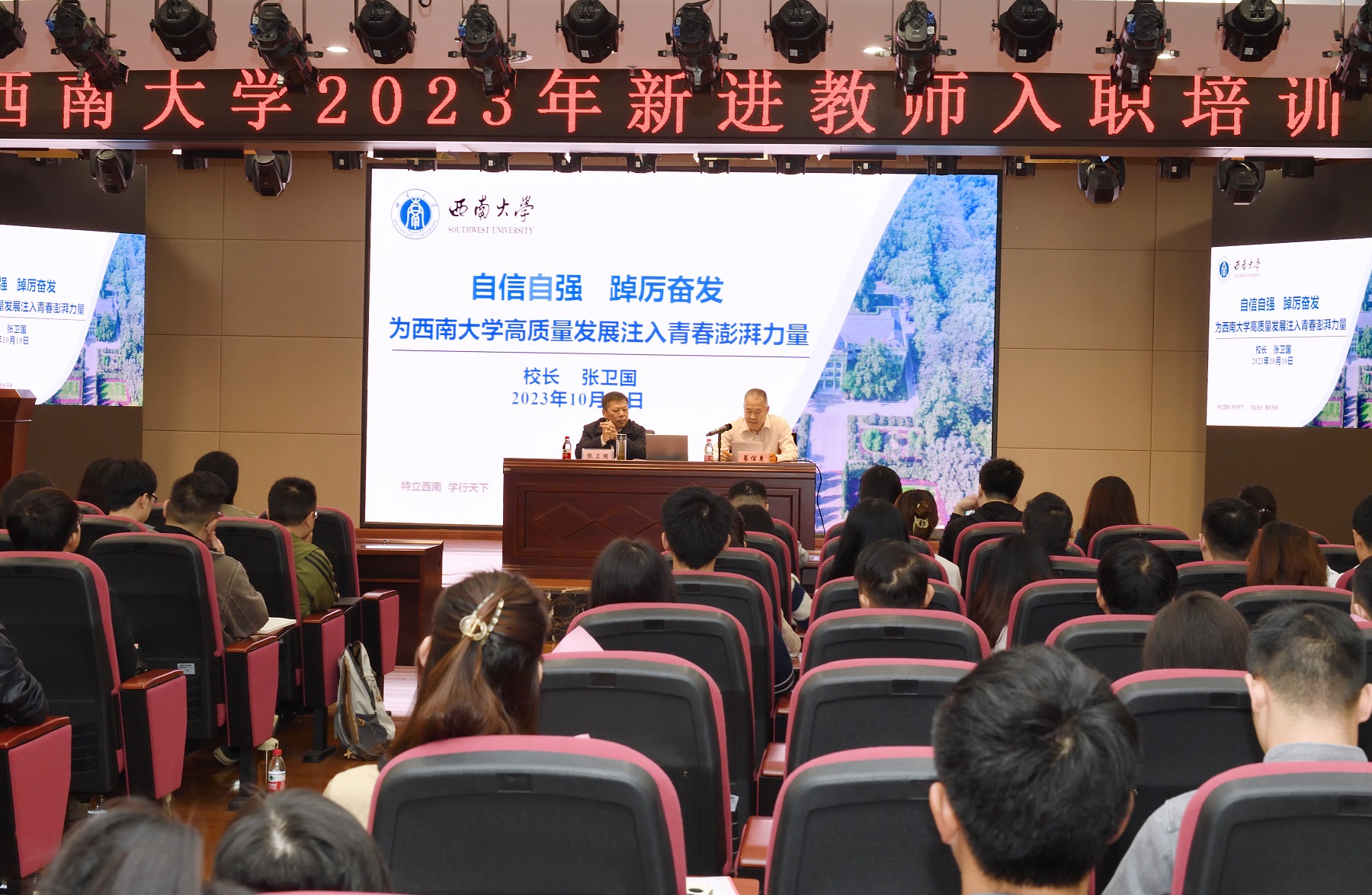10月10日,2023年新进教师入职培训第一讲在学校博物馆4楼多功能厅举行。校长张卫国出席并为新进教师作题为“自信自强、踔厉奋发,为taptap点点官方网站高质量发展注入青春澎湃力量”的讲座。培训由副校长葛信勇主持。