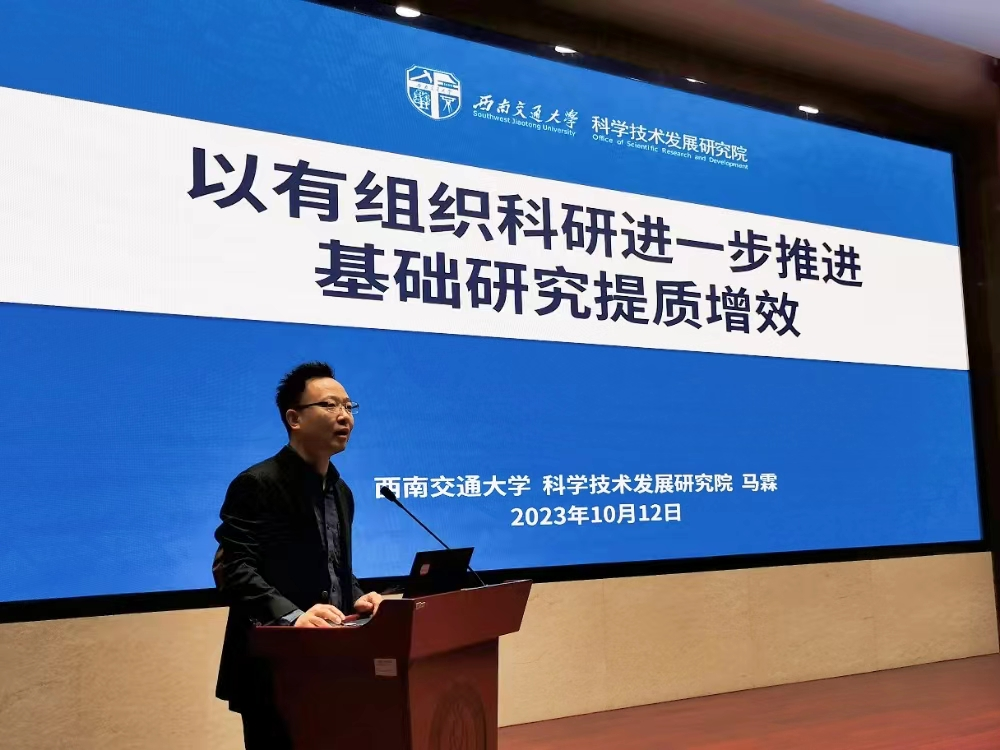 会议第一阶段,马霖作了题为“以有组织科研进一步推进基础研究提质增效”的报告,介绍了西南交通大学的学科特色及行业优势,开展有组织科研工作,以及国家自然科学基金组织申报方面的经验和特色做法。