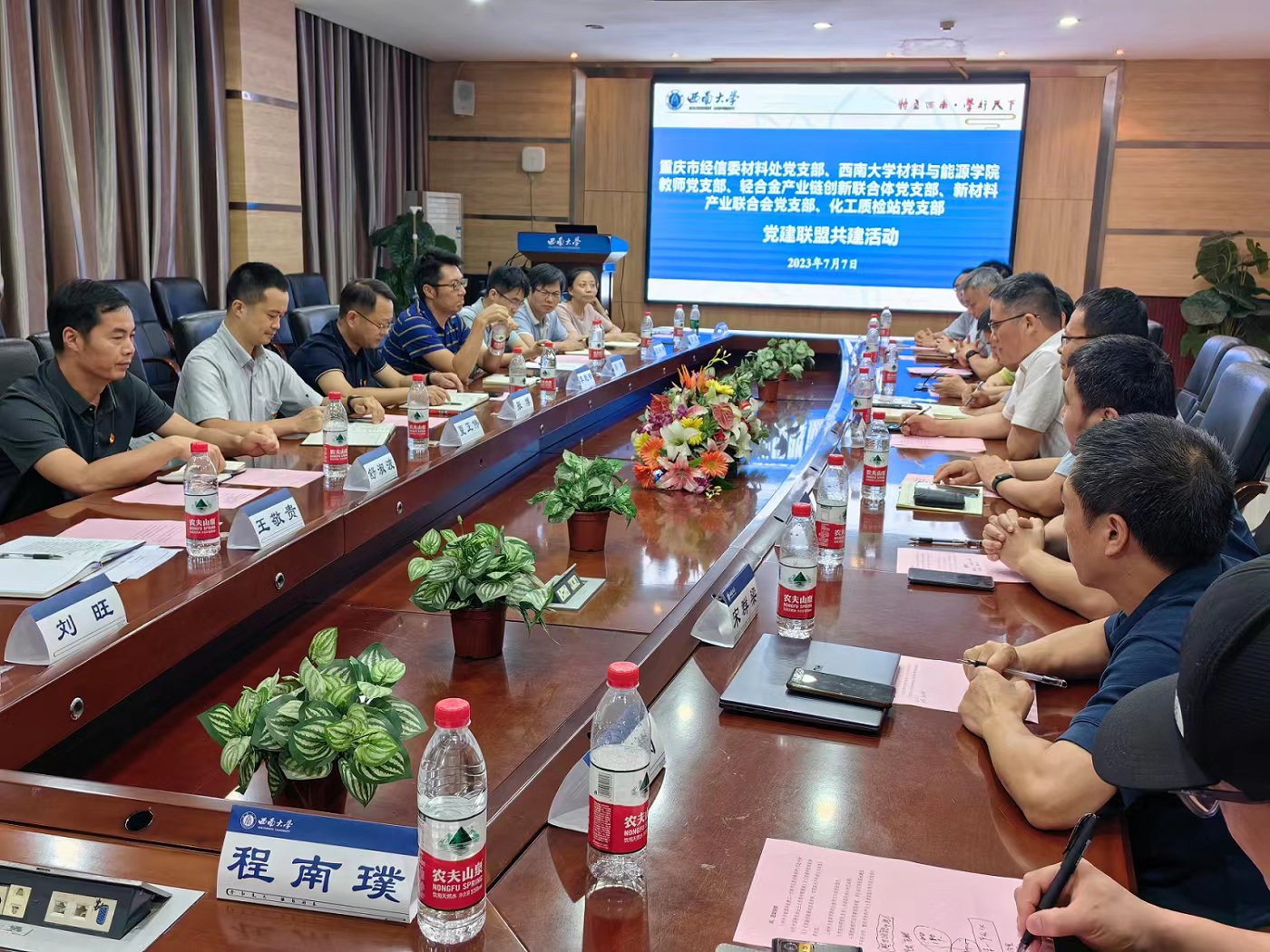 为深入开展学习贯彻习近平新时代中国特色社会主义思想主题教育,落实新时代党的建设总要求,以高质量党建推动政校行企深度合作交流,更好服务区域经济社会发展,构建政校行企协同育人新格局,7月7日下午,材料与能源学院党委与重庆市经济和信息化委员会材料工业处党支部、轻合金产业链创新联合体党支部、新材料产业联合会党支部、化工质检站党支部联合开展“以学促干,政校行企共建谋发展”党建联盟共建活动。学院党委书记梁武、院长徐茂文、副院长徐立群、副院长郭胜锋、各科研团队负责人、教师第一党支部党员,市经信委材料工业处处长兼支部书记张博、副处长李乾锋、副处长夏正伟及支部党员,新材料产业联合会秘书长王敬贵,轻合金产业链创新联合体秘书长刘旺,重庆化工质检站站长兼支部书记王裕明、副站长席敏等30余人参加活动,活动由梁武主持。