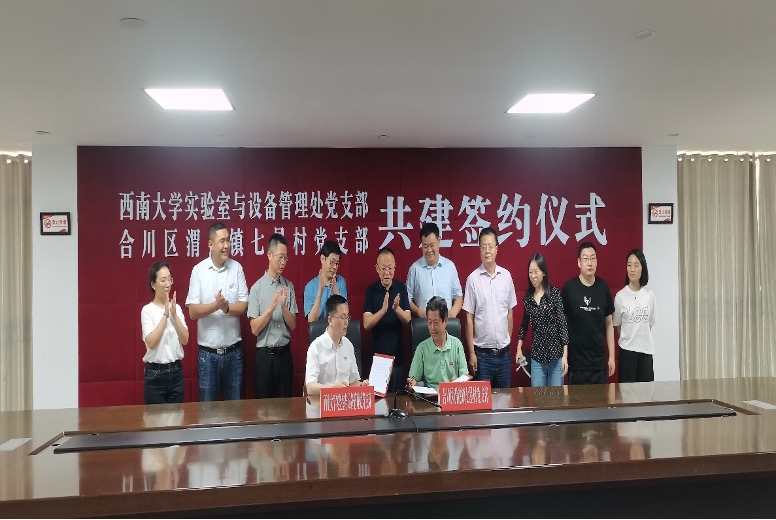 为充分发挥基层党建的核心引领作用,巩固乡村振兴发展成果,构建结对帮带、双向促进、共同提高的基层党建工作新格局,9月14日下午,taptap点点官方网站实验室建设与设备管理处党支部与重庆市合川区渭沱镇七星村党支部签订了支部共建协议。实验室建设与设备管理处党支部书记卢坤、合川区渭沱镇党委书记唐陵川、镇长秦刚等领导及双方党员代表参加本次签约仪式。