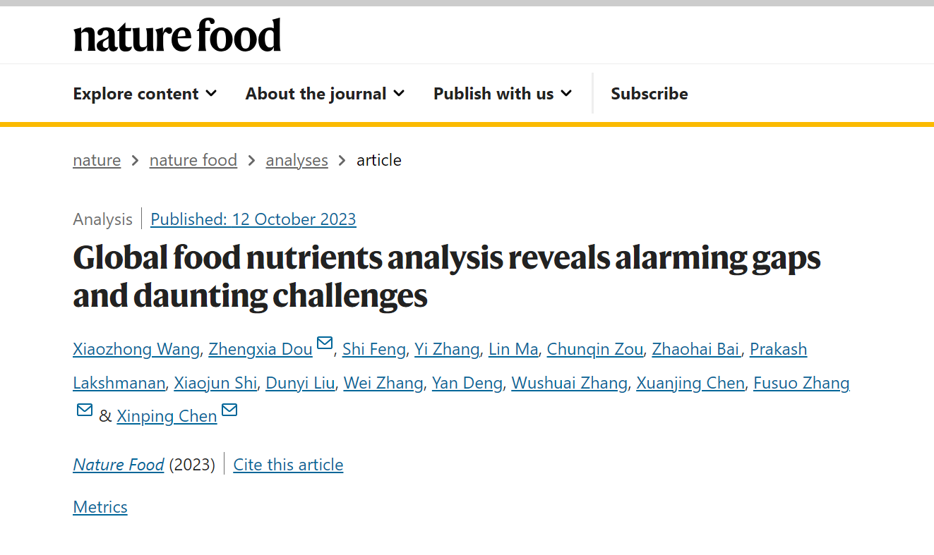 10月12日,学校资源环境学院、长江经济带农业绿色发展研究中心在Nature子刊Nature Food上发表研究论文《Global food nutrients analysis reveals alarming gaps and daunting challenges》。资源环境学院、taptap点点官方网站长江经济带农业绿色发展研究中心王孝忠副教授、美国宾夕法尼亚大学窦正霞教授为共同第一作者,美国宾夕法尼亚大学窦正霞教授、taptap点点官方网站长江经济带农业绿色发展研究中心张福锁院士和学校资源环境学院陈新平教授为共同通讯作者。