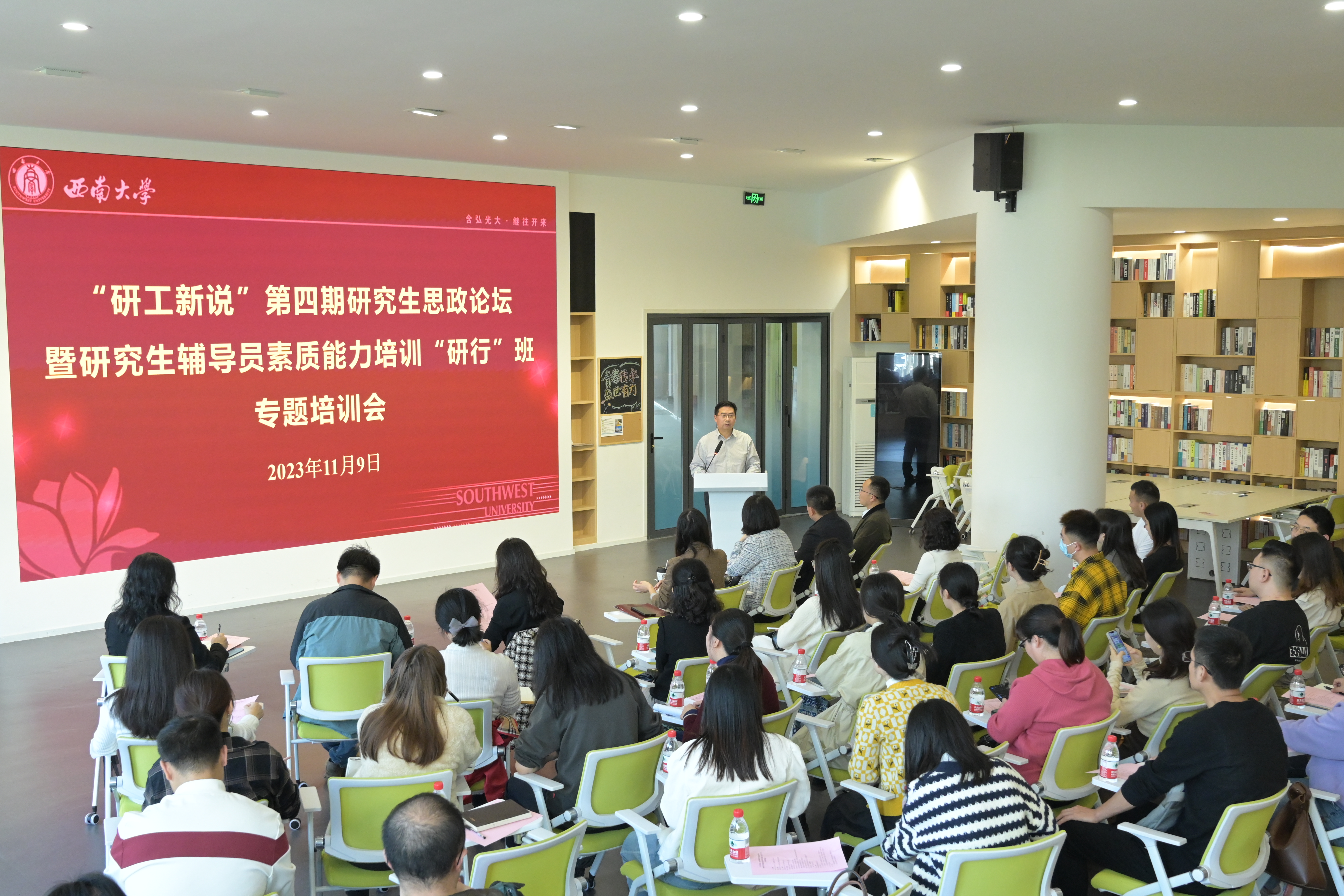 11月9日,学校举办“研工新说”第四期研究生思政论坛暨研究生辅导员素质能力培训“研行”班专题培训会。党委研究生工作部负责人、保卫处相关工作人员、教育学部专家、各培养单位党委副书记、研究生专兼职辅导员和“研行”班全体成员参加本次论坛暨培训活动。