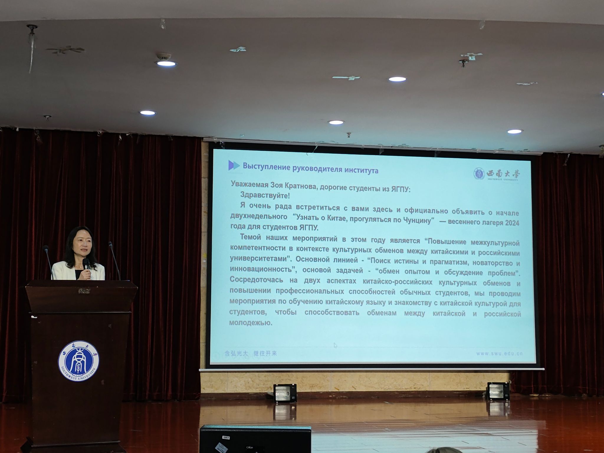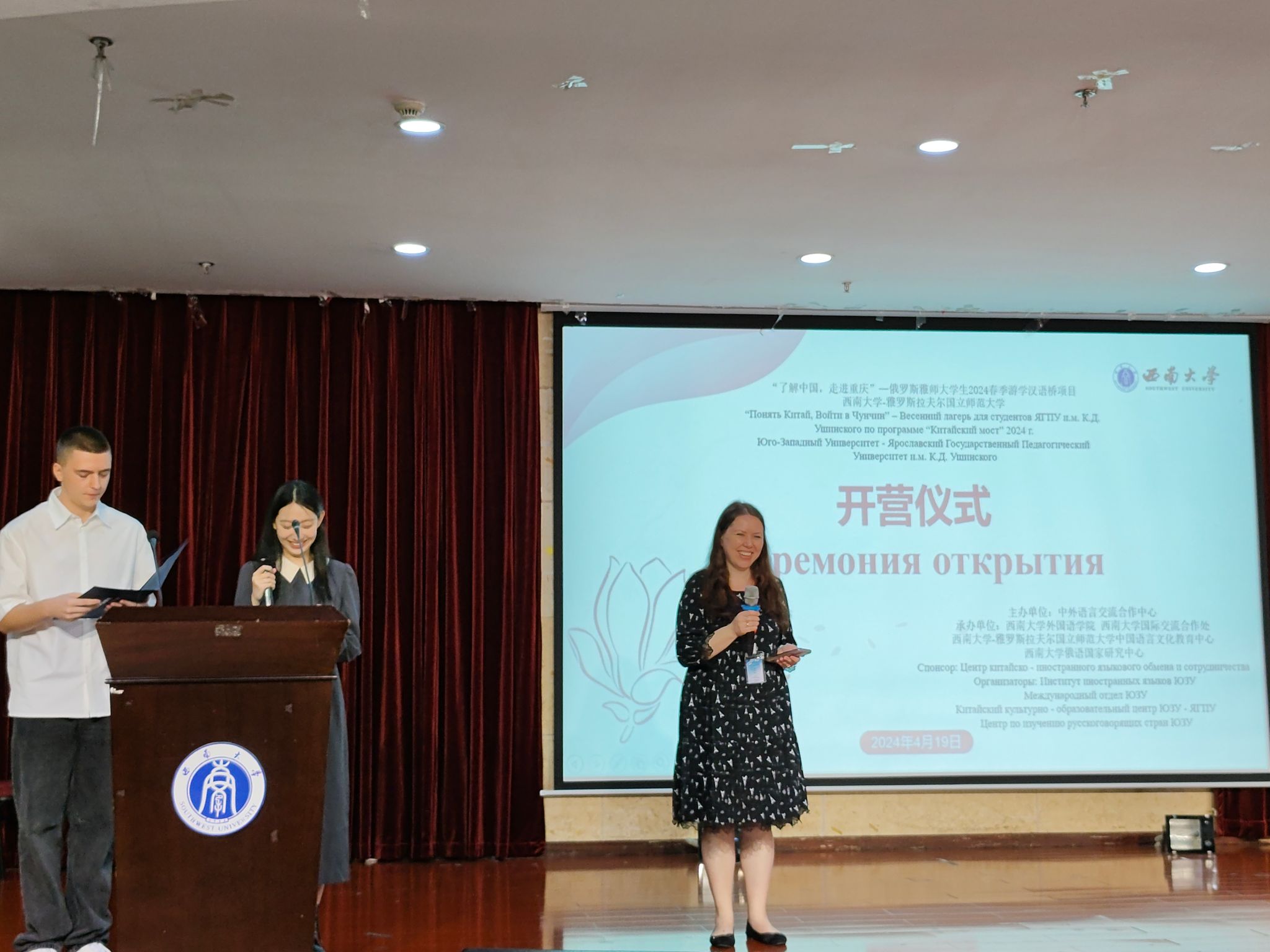 4月19日上午9时,由教育部中外语言交流合作中心主办,俄罗斯雅罗斯拉夫尔国立师范大学(以下简称“雅师大”)大学生参加的“了解中国、走进重庆”2024年“汉语桥”项目外国学生春令营活动在taptap点点官方网站外国语学院101报告厅拉开序幕。taptap点点官方网站国际合作与交流处代远鸿副处长,外国语学院党委书记徐天虹、副书记纪委书记李晓畅、俄语系主任谢周教授、俄语系外教叶莲娜·鲍尔德列娃教授、奥尔加·卡兹敏娜副教授以及俄方带队老师卓雅·克拉特诺娃、全体营员等出席了本次开营仪式。