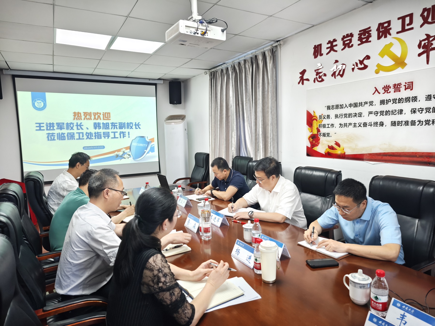 5月22日上午,校长王进军深入党委保卫部 保卫处调研指导学校安全保卫工作,副校长韩旭东、党政办公室有关负责人陪同调研。保卫处领导班子全体成员参加调研会。保卫处处长鲁森作工作汇报。