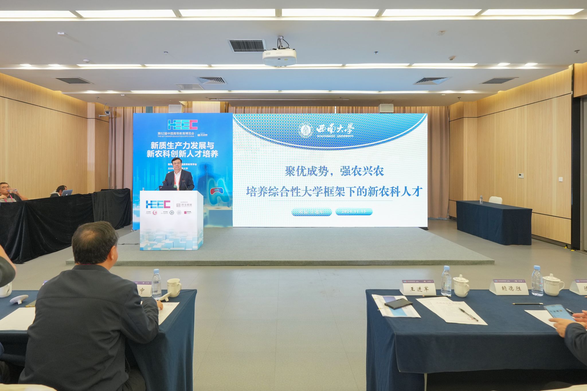 11月15日,由中国高等教育学会指导、学校主办的新质生产力发展与新农科创新人才培养论坛在重庆国际博览中心顺利召开,论坛是第62届中国高等教育博览会的同期学术活动之一。重庆市科技局二级巡视员陈桂中,中央党校(国家行政学院)教授赖德胜,中国农业大学副校长林万龙,西北农林科技大学副校长陈玉林,东北农业大学副校长陈庆山,浙江农林大学动物医学院院长宋厚辉,超星泛雅集团副总经理宋瑛,学校校长王进军、副校长周光明等来自全国20余所高校的200余名专家学者参加论坛。论坛以“新质生产力发展与新农科创新人才培养”为主题,由周光明主持。