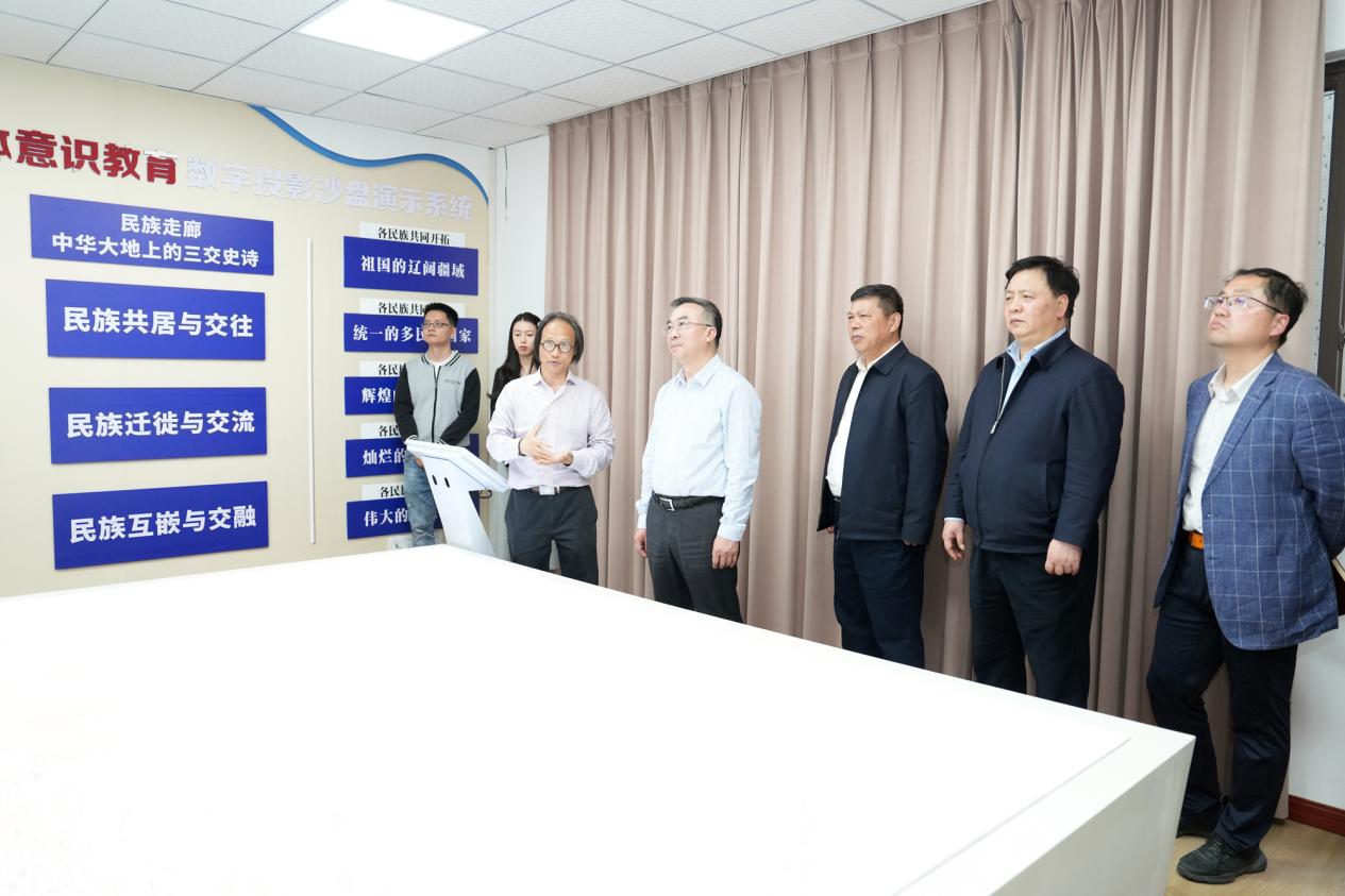 在铸牢中华民族共同体意识教育实验室,商奎听取了学校民族团结进步情况介绍,详细了解学校开展有关铸牢中华民族共同体意识的教育研究工作。他指出,要用好铸牢中华民族共同体意识相关研究成果,在融入教育教学实践中,继续拓展研究视野和研究深度,注重数字化赋能。